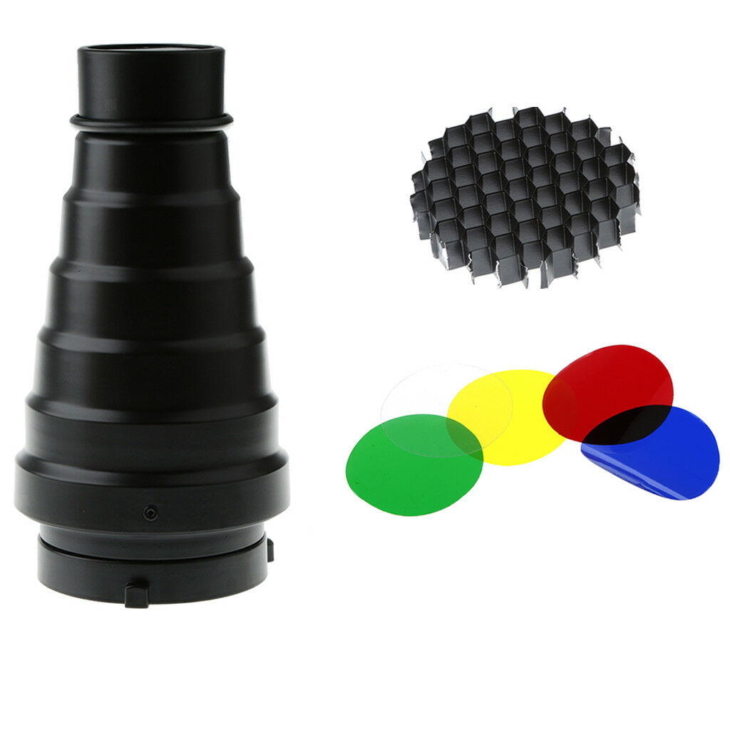 Flash Conical Snoot Honeycomb Grid Color Filter Kit for Bowens Mount Studio อุปกรณ์บังคับทิศทางแสงให้ไปตามทิศทางที่ต้องการ ใช้ร่วมกับไฟแฟลช, ไฟสตูดิโอ, ไฟ LED เมาท์ Bowens มาพร้อมรังผึ้ง และเจลสี 5 แผ่น (ขาว, เขียว, เหลือง, แดง, น้ำเงิน)